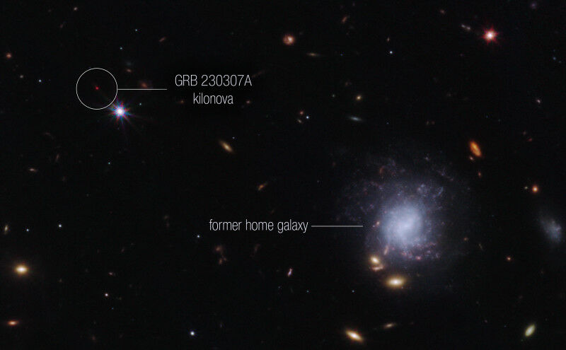 The stars travelled the approximate length of the Milky Way (about 120,000 light-years) outside of their home galaxy, before merging. Credit: NASA, ESA, CSA, STScI, Andrew Levan (IMAPP, Warw). Scientists have observed the creation of rare chemical elements in the second-brightest gamma-ray burst ever seen. Scientists have observed the creation of rare chemical elements in the second-brightest gamma-ray burst ever seen - casting new light on how heavy elements are made. Researchers examined the exceptionally bright gamma-ray burst GRB 230307A, which was caused by a neutron star merger. The explosion was observed using an array of ground and space-based telescopes, including NASA's James Webb Space Telescope, Fermi Gamma-ray Space Telescope, and Neil Gehrels Swift Observatory. Publishing their findings today in Nature (25 Oct), the international research team which included experts from the University of Birmingham, reveal that they found the heavy chemical element tellurium, in the aftermath of the explosion.