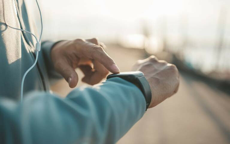 A person checking their smartwatch looking like they are doing exercise