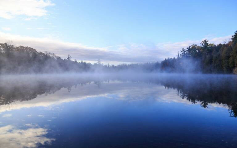 A lake surrounded by trees with wisps of mist on its surface.