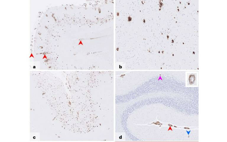 Amyloid deposits in brain - Amyloid deposition in brain tissue, seen in post-mortem analysis (figure from Nature Medicine paper ) Five cases of Alzheimer's disease are believed to have arisen as a result of medical treatments decades earlier, reports a team of UCL and UCLH researchers. Alzheimer's disease is caused by the amyloid-beta protein, and is usually a sporadic condition of late adult life, or more rarely an inherited condition that occurs due to a faulty gene. The new Nature Medicine paper provides the first evidence of Alzheimer's disease in living people that appears to have been medically acquired and due to transmission of the amyloid-beta protein. The people described in the paper had all been treated as children with a type of human growth hormone extracted from pituitary glands from deceased individuals (cadaver-derived human growth hormone or c'hGH). This was used to treat at least 1,848 people in the UK between 1959 and 1985, and used for various causes of short stature. It was withdrawn in 1985 after it was recognised that some c'hGH batches were contaminated with prions (infectious proteins) which had caused Creutzfeldt-Jakob disease (CJD) in some people. c'hGH was then replaced with synthetic growth hormone that did not carry the risk of transmitting CJD.