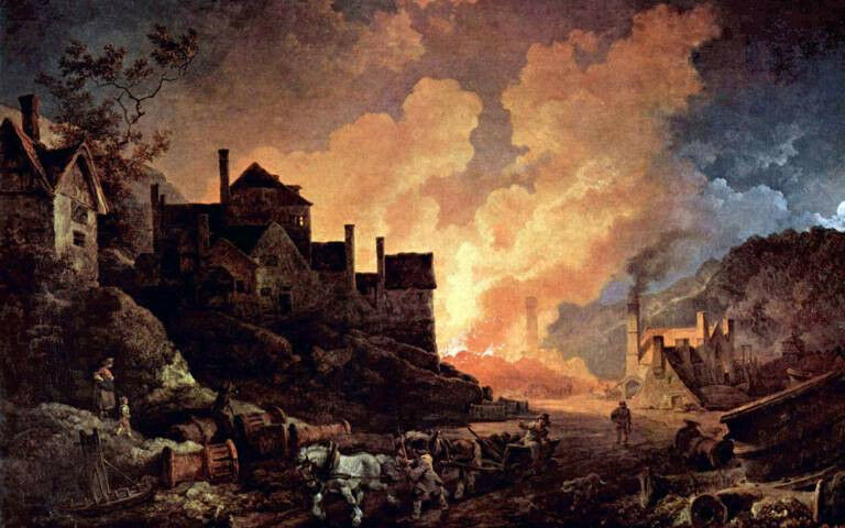 The painting Coalbrookdale by Night by Philippe Jacques de Loutherbourg, 1801. The iron foundry pictured would have used the new technique
