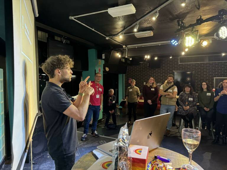 Launch of LGBTQ+ BSL vocab - Top: Launch of LGBTQ+ BSL Glossary (credit: DCAL) A new glossary of British Sign Language LGBTQ+ vocabulary, developed by UCL researchers and charity Deaf Rainbow UK, is featured on the BBC's latest Access All: Disability News and Mental Health podcast. Funded by a grant from UCL's LGBTQ+ Equality Implementation Group, the project set out to develop a British Sign Language Glossary with more terminology for the LGBTQ+ community. The project team, which consisted of Dr Kate Rowley, Dr Patrick Rosenburg, Dr Tyron Woolfe and Calum Medlock (UCL Deafness Cognition and Language Research Centre), worked closely with the charity Deaf Rainbow UK to propose over 109 words for development into BSL. The 20 words and phrases that were developed were: Ally, Attraction, Bicurious, Bisexual, Cisgender, Gay, Gender, Lesbian, Monogamy, Open Relationship, Panromantic, Pansexual, Polyamorous, Questioning, Sexuality, Sexually Fluid, Straight, Throuple, Transman and Transwoman. The project group consulted with Deaf and LGBTQ+ focus groups and the proposed signs were shared with the Deaf LGBTQ+ community at UCL for feedback. Once refined, the 20 words and phrases were launched on the , with videos demonstrating the individual signs. An evening of Deaf Drag Bingo (using the new signs and not numbers) followed to celebrate the launch.