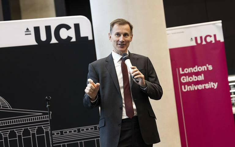 Chancellor Jeremy Hunt, the Chancellor of the Exchequer, was among a number of government ministers to visit UCL East today to mark the publication of the Independent Review of University Spinout Companies. Also attending the event were university leaders, investors, spinout founders, and heads of technology transfer offices (TTOs), which are responsible for commercialising university research. The review, whose recommendations the Chancellor accepted in full, provides best practice, "innovation-friendly" guidelines that aim to make the UK the best place in the world to start a spinout company. Ahead of the Autumn Statement on Wednesday, the Chancellor also announced £20 million for university-created businesses. The Chancellor was joined at UCL East by Michelle Donelan, Secretary of State Science, Innovation and Technology, and Andrew Griffith, Minister for Science, Innovation and Technology. The Chancellor was given demonstrations of three successful UCL spinouts - Kit-AR, an augmented reality technology platform which improves production processes and quality control by guiding assembly workers in real time; Tenpoint Therapeutics, which uses pioneering cell engineering to tackle age-related or inherited sight loss; and CarbonRe, which uses AI technology to help heavy industry cut its emissions. Ministers were welcomed by Dr Michael Spence, UCL President & Provost, Professor Paola Lettieri, Pro-Provost (UCL East), and Dr Anne Lane, CEO of UCL's technology transfer office, UCL Business (UCLB).