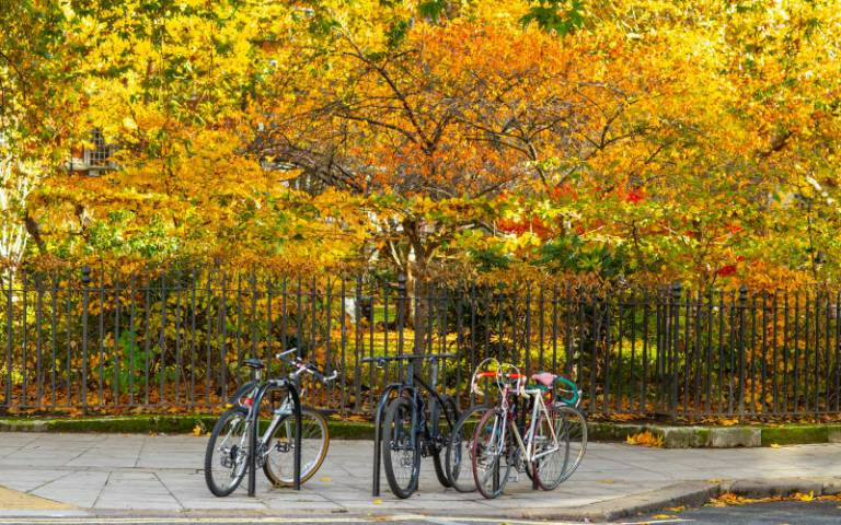 Four bicycles attached to bike stands in front of railings. Behind the railings are trees with leaves in bright Autumn colours of red, yellow and orange.
