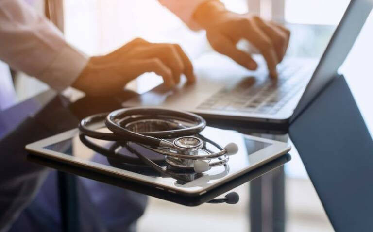 Male doctor hands typing on laptop computer keyboard, search medical information with digital tablet pc and medical stethoscope on the desk at office.