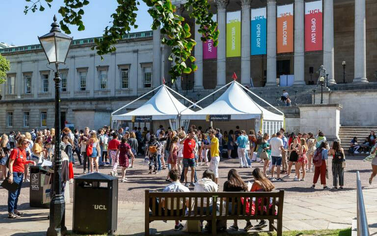 Visitors talking in the quad at a UCL open day