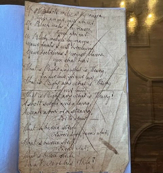 Page 1 of the cancelled manuscript of Ye Jacobites by Name in the handwriting of Robert Burns was discovered in the collection of Burns materials held at Barnbougle Castle, near Edinburgh. Photo by Dr Pauline Mackay (by permission Dalmeny Estate Collections) The cancelled working manuscript of the song - Ye Jacobites by Name - was written by Burns in 1791 in the inflammatory early period of the French Revolution, against which reformers in the British Isles increasingly agitated for political change. Robert Burns wrote about revolutionary themes that if published might have placed him under suspicion with the authorities. The discovery of a cancelled manuscript by Burns, an early version of one of his most famous songs, is the most explicit instance of several where he ostensibly writes about history but actually has his eye on 18 century current affairs following the French Revolution. The finding by a leading Burns expert based at the University of Glasgow is of another version of Burns' song, 'Ye Jacobites by Name'. The cancelled working manuscript of the song was written by Burns in 1791 in the inflammatory early period of the French Revolution, against which reformers in the British Isles increasingly agitated for political change. While today Burns is a world-renowned poet and songwriter, he lived a life in which he had no political vote, even as a highly skilled Exciseman working for the very government that denied him that right.