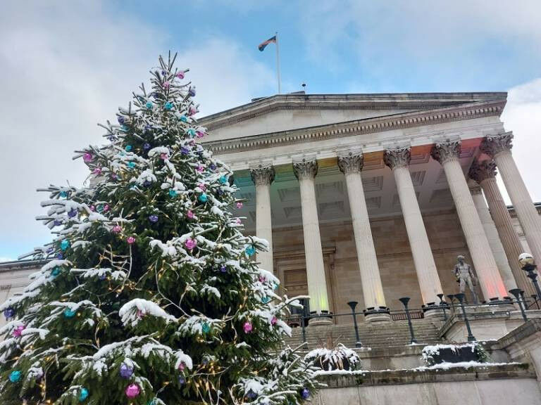 UCL’s Christmas tree in the Quad, December 2023. The tree is in the foreground, decorated with baubles. The Quad is in the background, lit up in rainbow colours. It is day time and there is a covering of snow over everything.